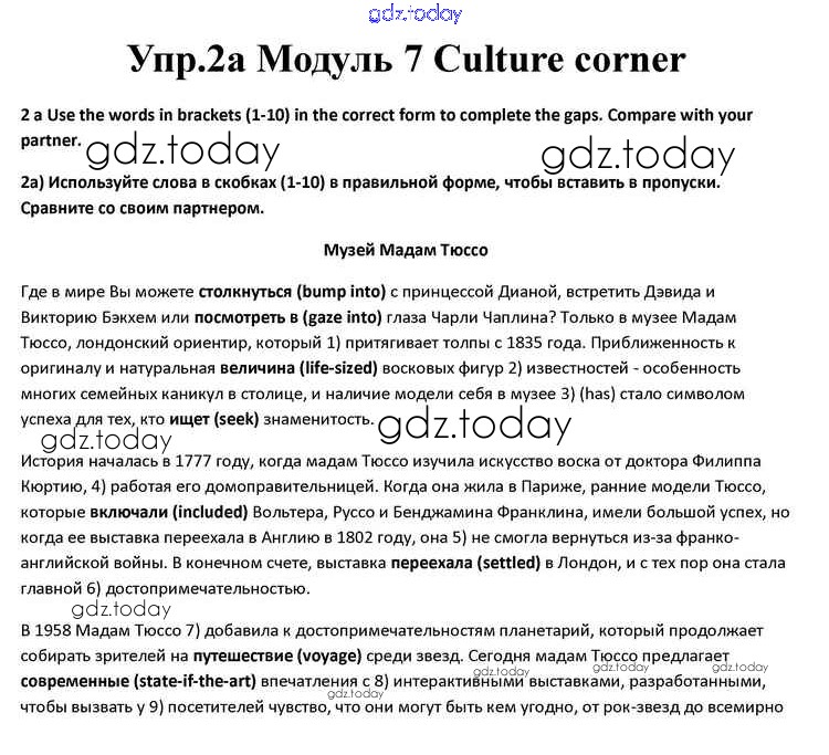 На страницах сайта gdz.today вы найдете учебный и вспомогательный материал, направленный на улучшения знаний школьной программы. ГДЗ - онлайн мир знаний Culture corner Решение к Module 7 2a Учебнику по Английскому языку для 10 класса Афанасьева, Дули Просвещение Spotlight 2015