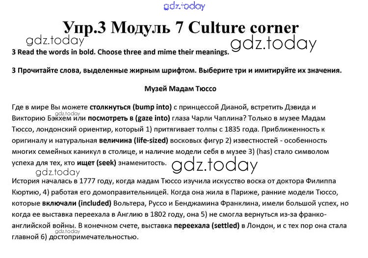 На страницах сайта gdz.today вы найдете учебный и вспомогательный материал, направленный на улучшения знаний школьной программы. ГДЗ - онлайн мир знаний Culture corner Решение к Module 7 3 Учебнику по Английскому языку для 10 класса Афанасьева, Дули Просвещение Spotlight 2015