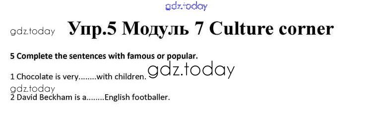 На страницах сайта gdz.today вы найдете учебный и вспомогательный материал, направленный на улучшения знаний школьной программы. ГДЗ - онлайн мир знаний Culture corner Решение к Module 7 5 Учебнику по Английскому языку для 10 класса Афанасьева, Дули Просвещение Spotlight 2015