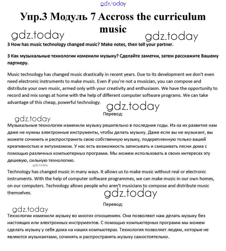 На страницах сайта gdz.today вы найдете учебный и вспомогательный материал, направленный на улучшения знаний школьной программы. ГДЗ - онлайн мир знаний Accross the curriculum Music Решение к Module 7 3 Учебнику по Английскому языку для 10 класса Афанасьева, Дули Просвещение Spotlight 2015