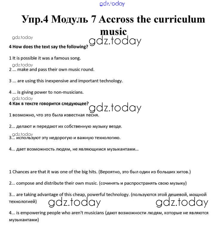 На страницах сайта gdz.today вы найдете учебный и вспомогательный материал, направленный на улучшения знаний школьной программы. ГДЗ - онлайн мир знаний Accross the curriculum Music Решение к Module 7 4 Учебнику по Английскому языку для 10 класса Афанасьева, Дули Просвещение Spotlight 2015