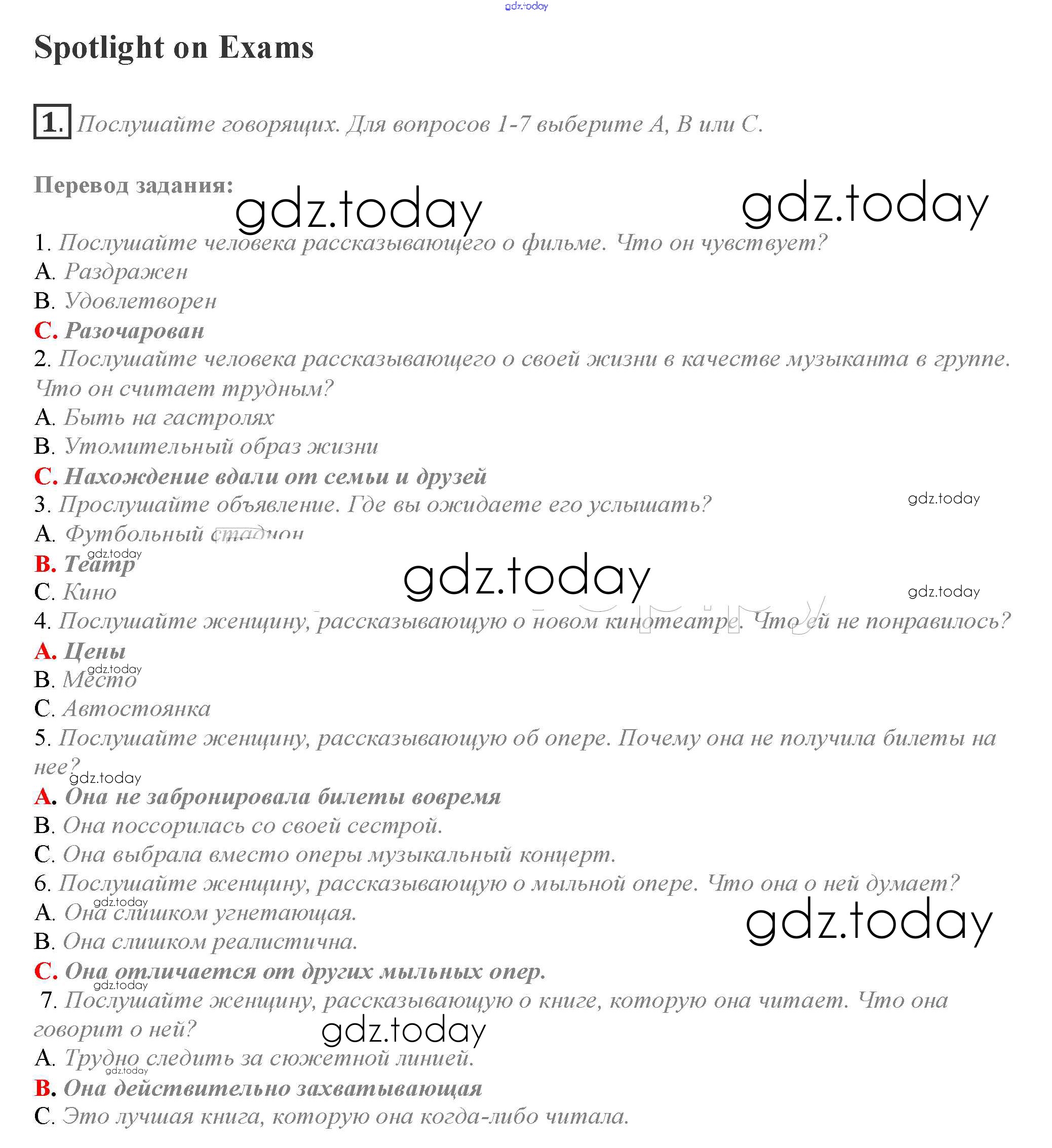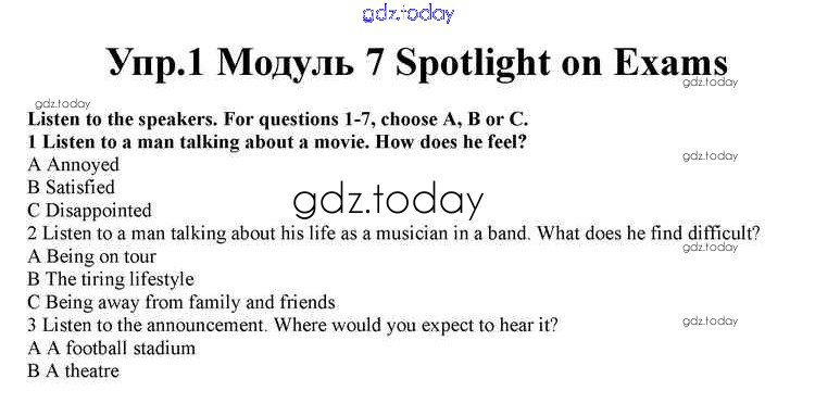 На страницах сайта gdz.today вы найдете учебный и вспомогательный материал, направленный на улучшения знаний школьной программы. ГДЗ - онлайн мир знаний Spotlight on Exams Решение к Module 7 1 Учебнику по Английскому языку для 10 класса Афанасьева, Дули Просвещение Spotlight 2015