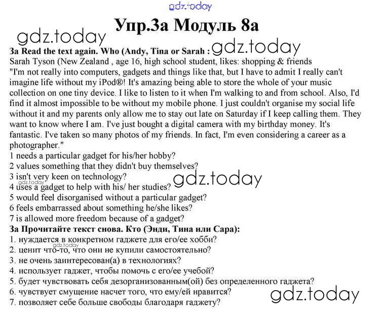 На страницах сайта gdz.today вы найдете учебный и вспомогательный материал, направленный на улучшения знаний школьной программы. ГДЗ - онлайн мир знаний Часть 8a Решение к Module 8 3a Учебнику по Английскому языку для 10 класса Афанасьева, Дули Просвещение Spotlight 2015