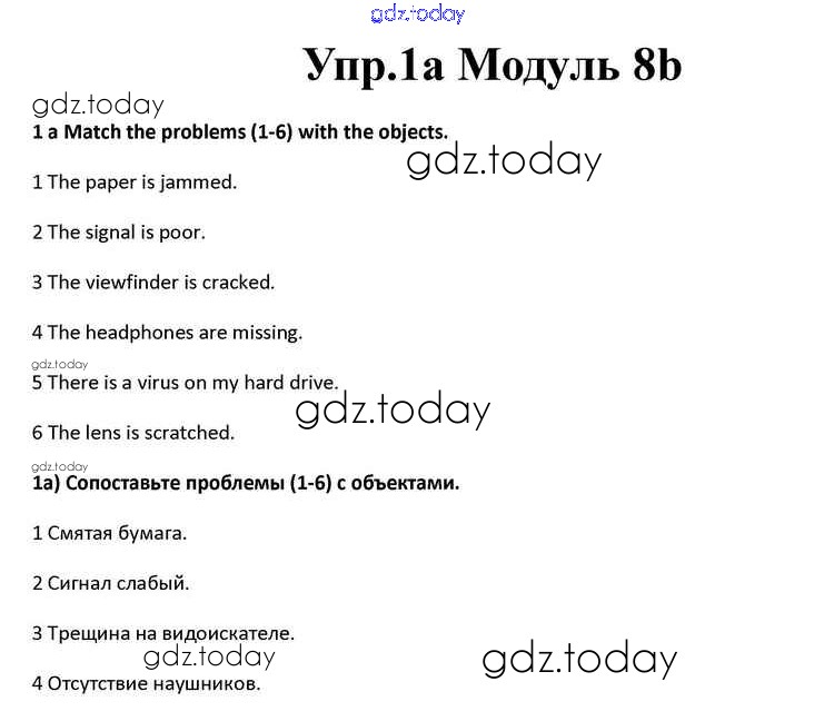 На страницах сайта gdz.today вы найдете учебный и вспомогательный материал, направленный на улучшения знаний школьной программы. ГДЗ - онлайн мир знаний Часть 8b Решение к Module 8 1a Учебнику по Английскому языку для 10 класса Афанасьева, Дули Просвещение Spotlight 2015
