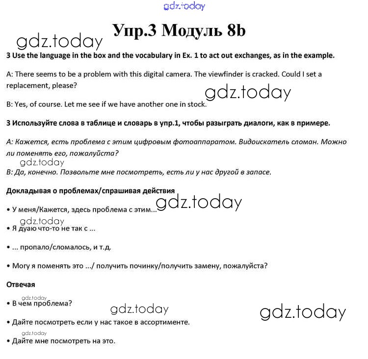 На страницах сайта gdz.today вы найдете учебный и вспомогательный материал, направленный на улучшения знаний школьной программы. ГДЗ - онлайн мир знаний Часть 8b Решение к Module 8 3 Учебнику по Английскому языку для 10 класса Афанасьева, Дули Просвещение Spotlight 2015