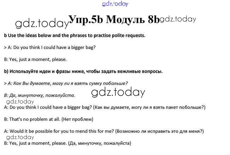 На страницах сайта gdz.today вы найдете учебный и вспомогательный материал, направленный на улучшения знаний школьной программы. ГДЗ - онлайн мир знаний Часть 8b Решение к Module 8 5b Учебнику по Английскому языку для 10 класса Афанасьева, Дули Просвещение Spotlight 2015