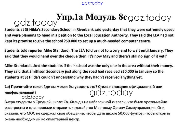 На страницах сайта gdz.today вы найдете учебный и вспомогательный материал, направленный на улучшения знаний школьной программы. ГДЗ - онлайн мир знаний Часть 8c Решение к Module 8 1a Учебнику по Английскому языку для 10 класса Афанасьева, Дули Просвещение Spotlight 2015