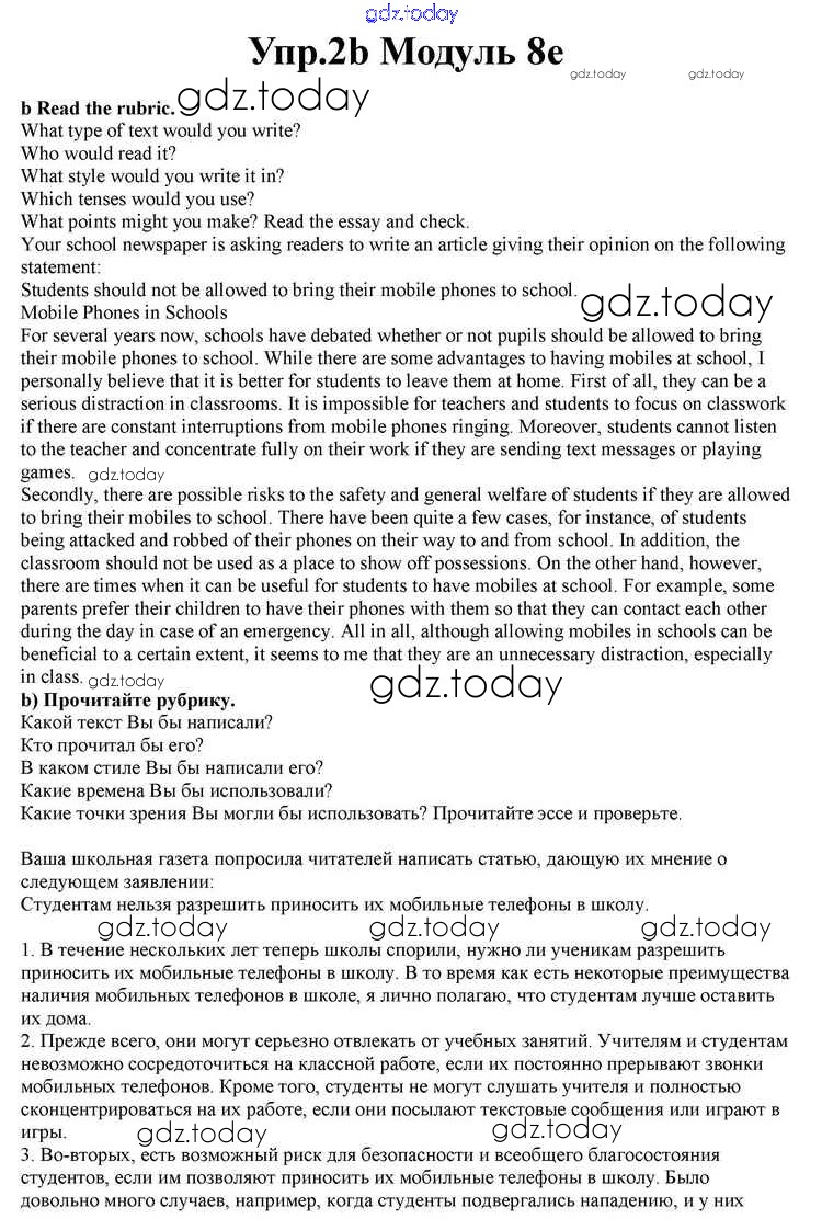 На страницах сайта gdz.today вы найдете учебный и вспомогательный материал, направленный на улучшения знаний школьной программы. ГДЗ - онлайн мир знаний Часть 8e Решение к Module 8 2b Учебнику по Английскому языку для 10 класса Афанасьева, Дули Просвещение Spotlight 2015