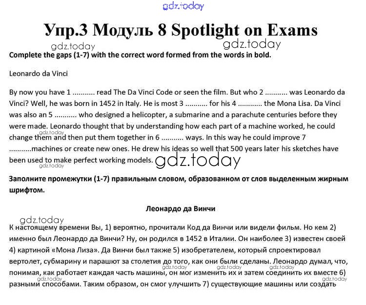 На страницах сайта gdz.today вы найдете учебный и вспомогательный материал, направленный на улучшения знаний школьной программы. ГДЗ - онлайн мир знаний Spotlight on Exams Решение к Module 8 3 Учебнику по Английскому языку для 10 класса Афанасьева, Дули Просвещение Spotlight 2015