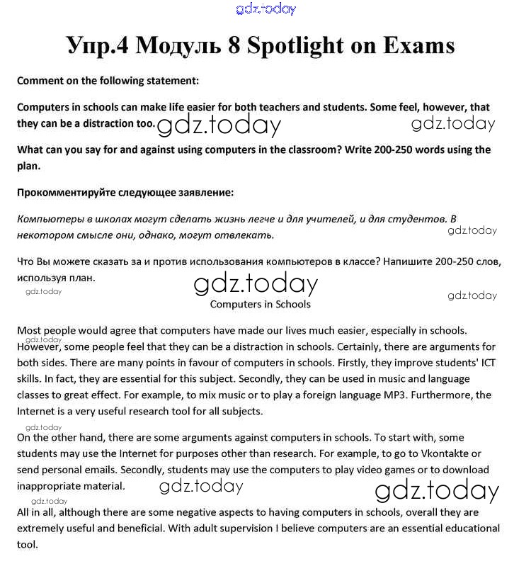На страницах сайта gdz.today вы найдете учебный и вспомогательный материал, направленный на улучшения знаний школьной программы. ГДЗ - онлайн мир знаний Spotlight on Exams Решение к Module 8 4 Учебнику по Английскому языку для 10 класса Афанасьева, Дули Просвещение Spotlight 2015