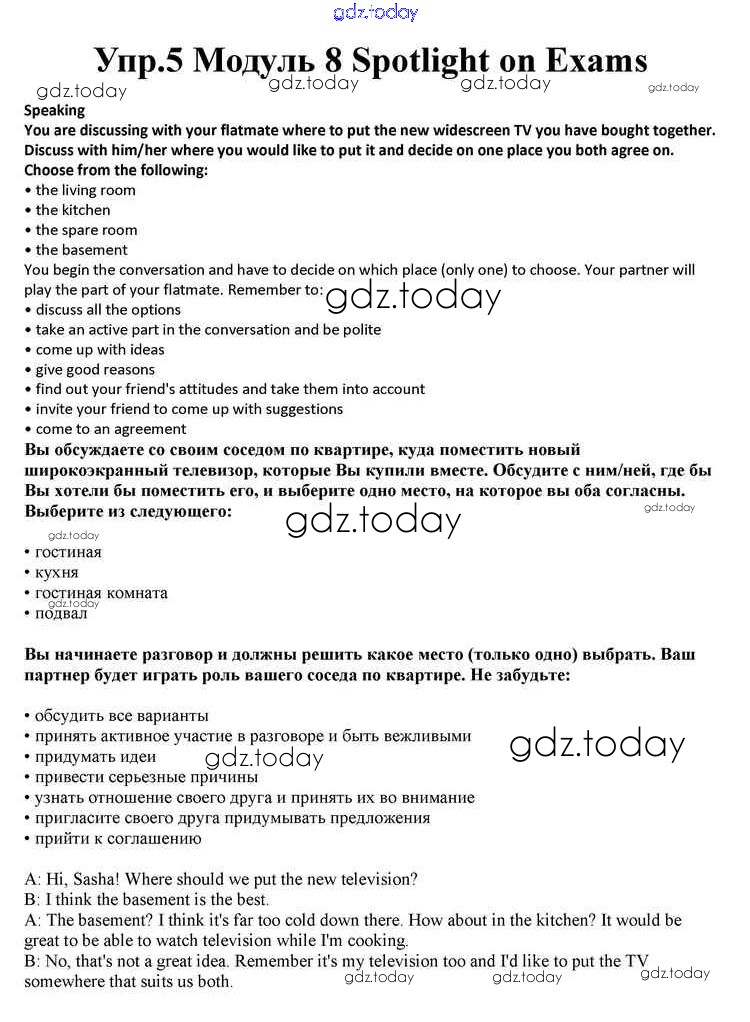 На страницах сайта gdz.today вы найдете учебный и вспомогательный материал, направленный на улучшения знаний школьной программы. ГДЗ - онлайн мир знаний Spotlight on Exams Решение к Module 8 5 Учебнику по Английскому языку для 10 класса Афанасьева, Дули Просвещение Spotlight 2015
