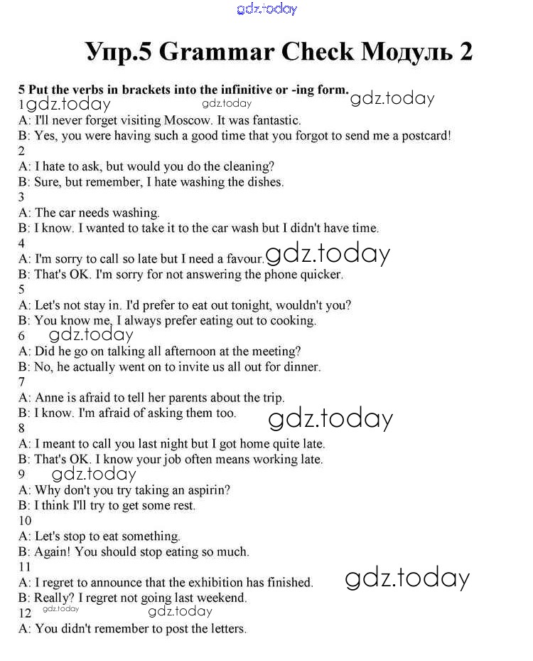 На страницах сайта gdz.today вы найдете учебный и вспомогательный материал, направленный на улучшения знаний школьной программы. ГДЗ - онлайн мир знаний Module 2 Grammar Check 5 Учебнику по Английскому языку для 10 класса Афанасьева, Дули Просвещение Spotlight 2015