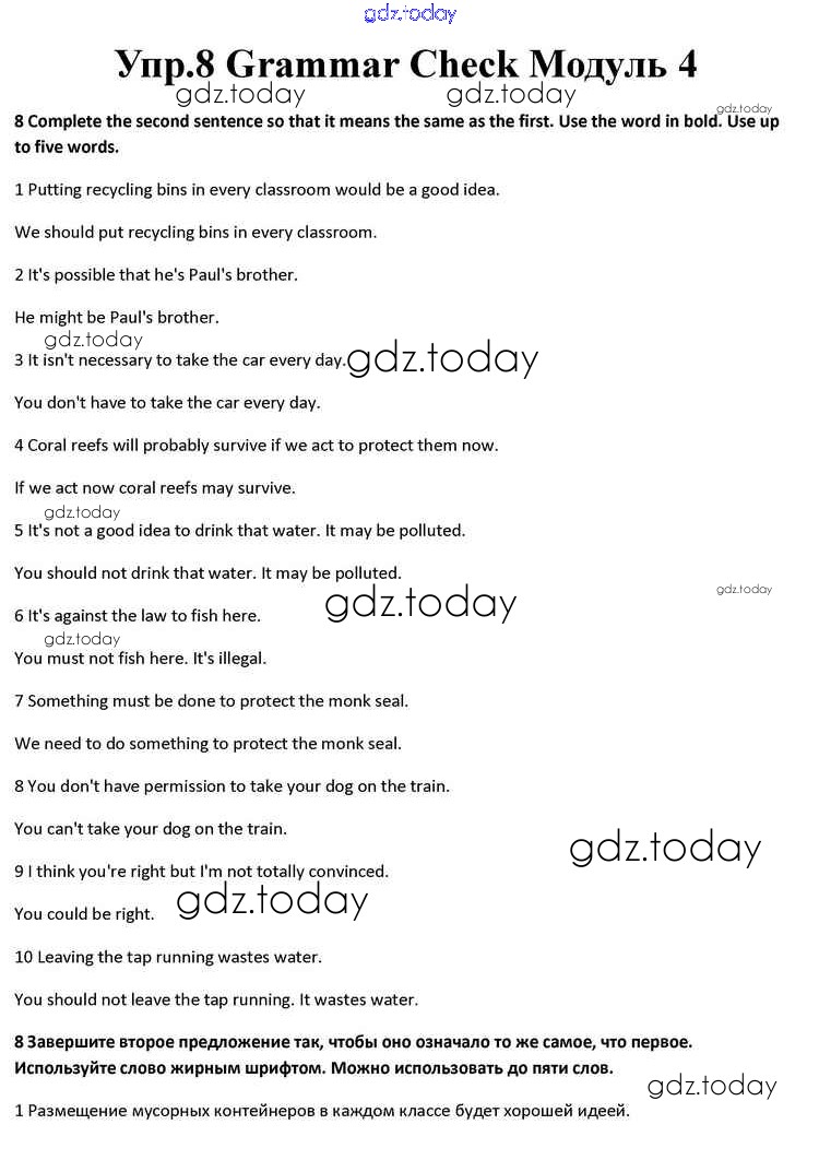 На страницах сайта gdz.today вы найдете учебный и вспомогательный материал, направленный на улучшения знаний школьной программы. ГДЗ - онлайн мир знаний Module 4 Grammar Check 8 Учебнику по Английскому языку для 10 класса Афанасьева, Дули Просвещение Spotlight 2015
