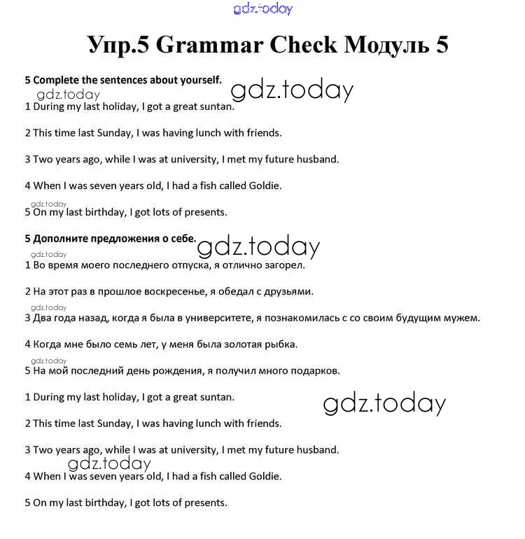 На страницах сайта gdz.today вы найдете учебный и вспомогательный материал, направленный на улучшения знаний школьной программы. ГДЗ - онлайн мир знаний Module 5 Grammar Check 5 Учебнику по Английскому языку для 10 класса Афанасьева, Дули Просвещение Spotlight 2015