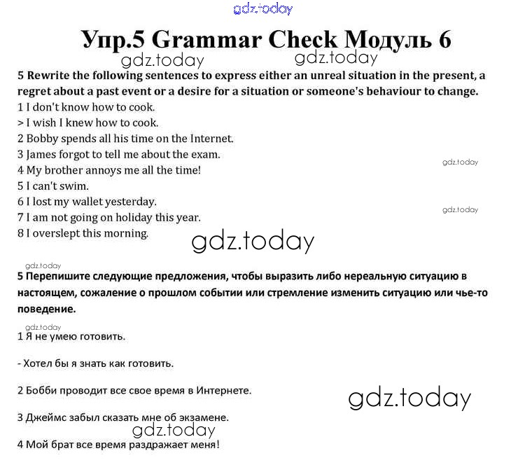 На страницах сайта gdz.today вы найдете учебный и вспомогательный материал, направленный на улучшения знаний школьной программы. ГДЗ - онлайн мир знаний Module 6 Grammar Check 5 Учебнику по Английскому языку для 10 класса Афанасьева, Дули Просвещение Spotlight 2015