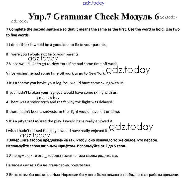 На страницах сайта gdz.today вы найдете учебный и вспомогательный материал, направленный на улучшения знаний школьной программы. ГДЗ - онлайн мир знаний Module 6 Grammar Check 7 Учебнику по Английскому языку для 10 класса Афанасьева, Дули Просвещение Spotlight 2015
