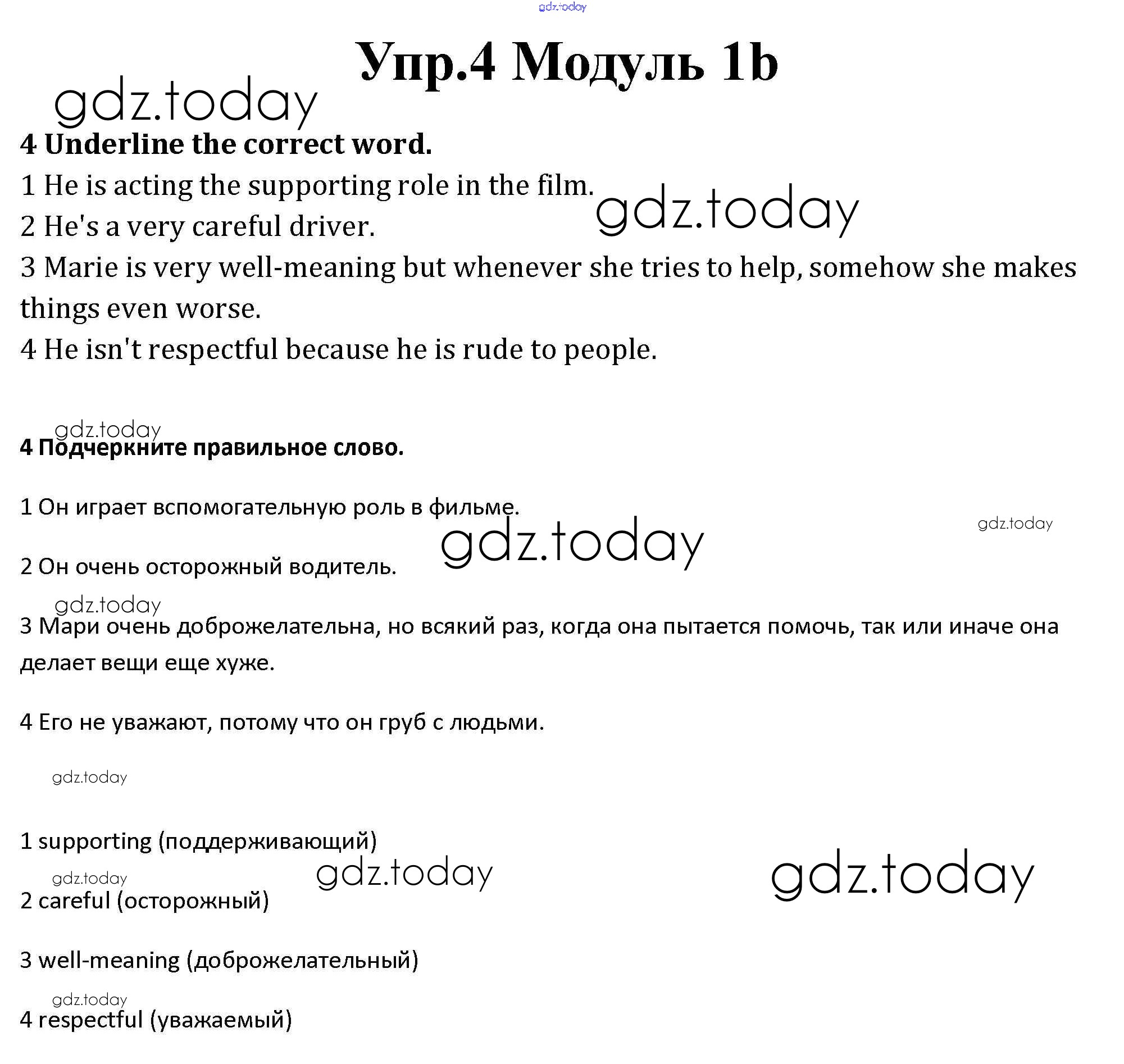 На страницах сайта gdz.today вы найдете учебный и вспомогательный материал, направленный на улучшения знаний школьной программы. ГДЗ - онлайн мир знаний Часть 1b Решение к Module 1 4 Рабочей тетради по Английскому языку для 10 класса Афанасьева, Дули Базовый уровень Просвещение Spotlight 2015