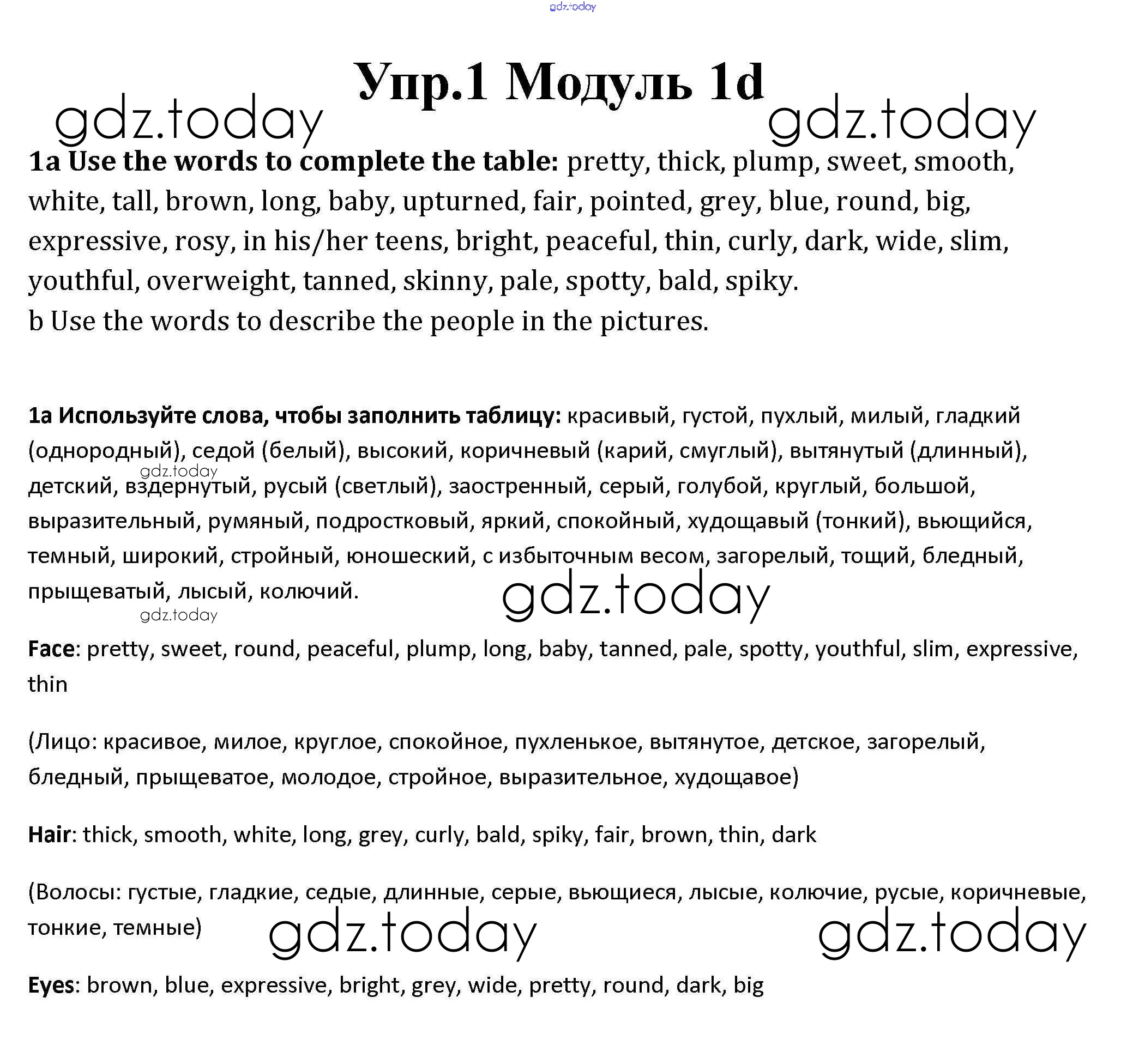 На страницах сайта gdz.today вы найдете учебный и вспомогательный материал, направленный на улучшения знаний школьной программы. ГДЗ - онлайн мир знаний Часть 1d Решение к Module 1 1 Рабочей тетради по Английскому языку для 10 класса Афанасьева, Дули Базовый уровень Просвещение Spotlight 2015