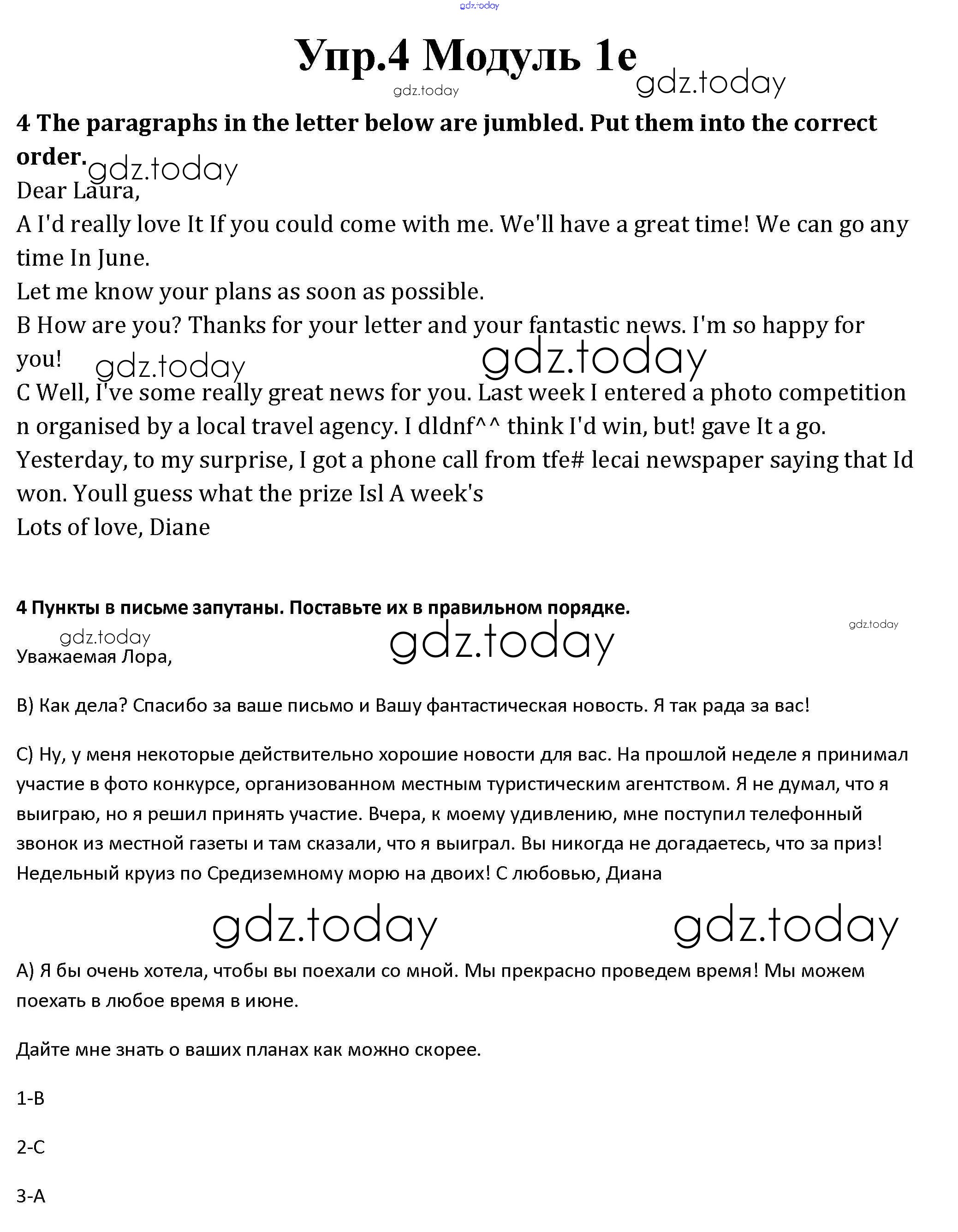 На страницах сайта gdz.today вы найдете учебный и вспомогательный материал, направленный на улучшения знаний школьной программы. ГДЗ - онлайн мир знаний Часть 1e Решение к Module 1 4 Рабочей тетради по Английскому языку для 10 класса Афанасьева, Дули Базовый уровень Просвещение Spotlight 2015