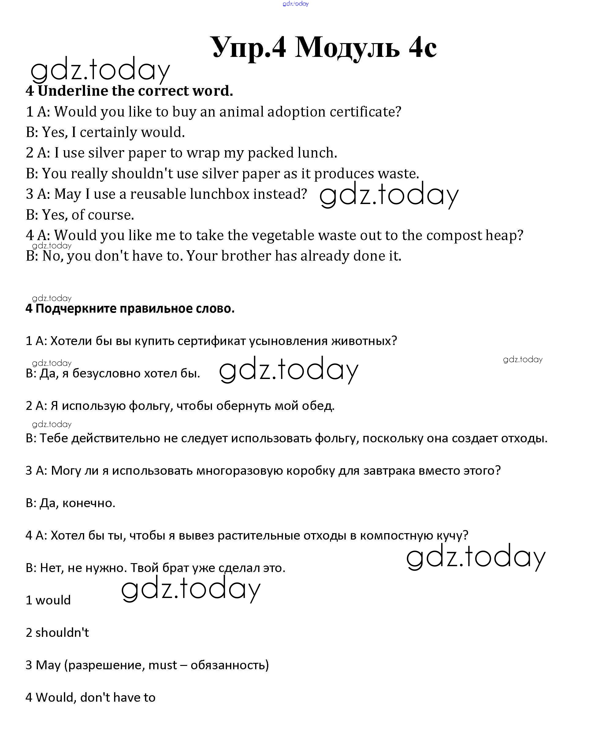 На страницах сайта gdz.today вы найдете учебный и вспомогательный материал, направленный на улучшения знаний школьной программы. ГДЗ - онлайн мир знаний Часть 4c Решение к Module 4 4 Рабочей тетради по Английскому языку для 10 класса Афанасьева, Дули Базовый уровень Просвещение Spotlight 2015