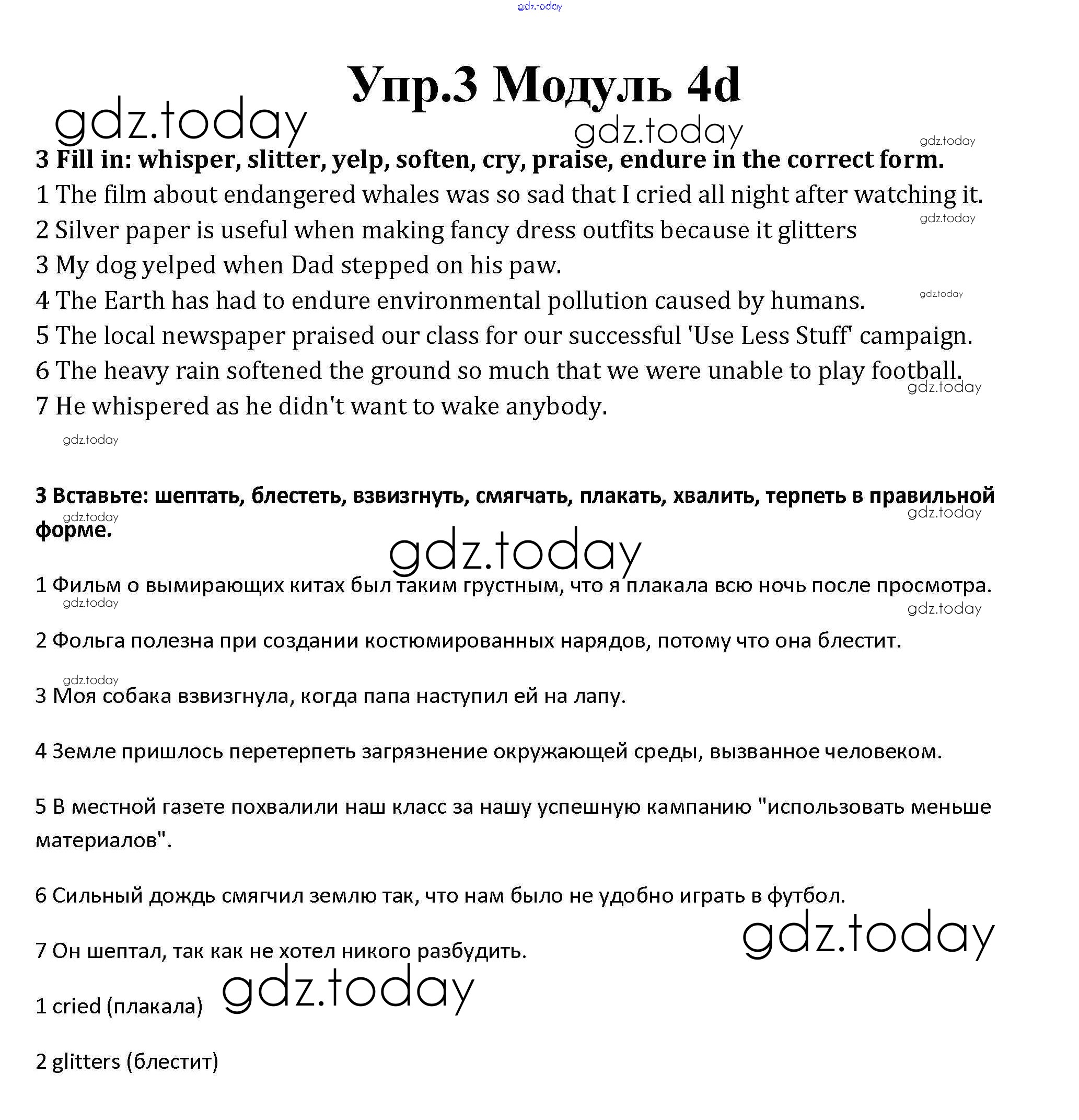На страницах сайта gdz.today вы найдете учебный и вспомогательный материал, направленный на улучшения знаний школьной программы. ГДЗ - онлайн мир знаний Часть 4d Решение к Module 4 3 Рабочей тетради по Английскому языку для 10 класса Афанасьева, Дули Базовый уровень Просвещение Spotlight 2015