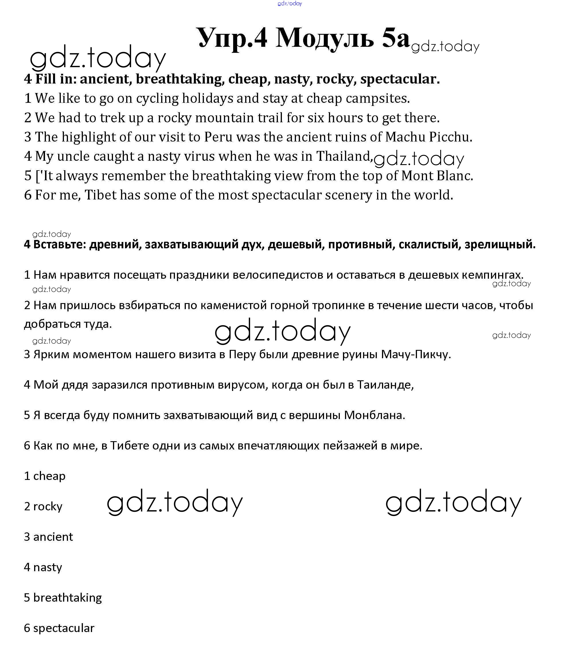 На страницах сайта gdz.today вы найдете учебный и вспомогательный материал, направленный на улучшения знаний школьной программы. ГДЗ - онлайн мир знаний Часть 5a Решение к Module 5 4 Рабочей тетради по Английскому языку для 10 класса Афанасьева, Дули Базовый уровень Просвещение Spotlight 2015