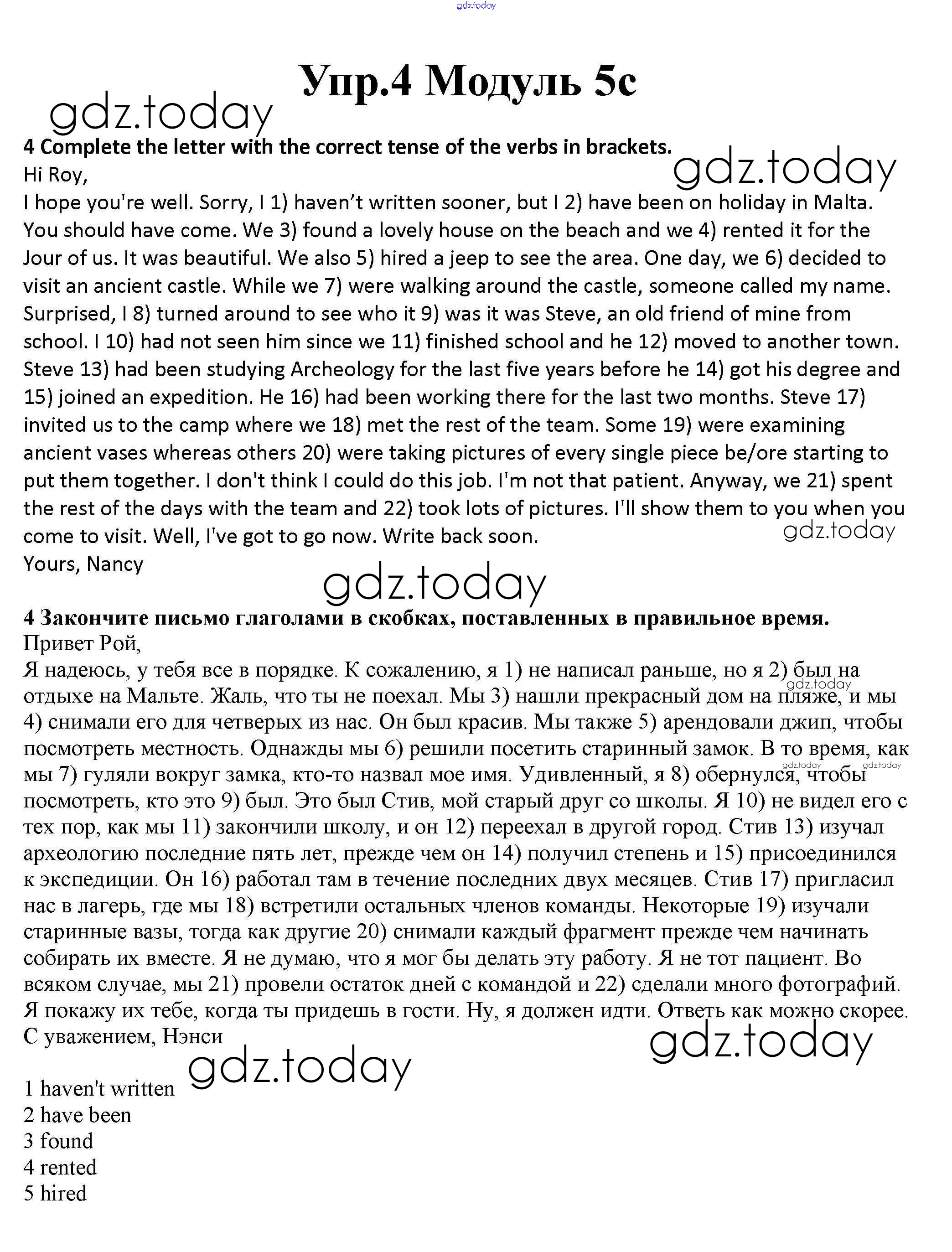 На страницах сайта gdz.today вы найдете учебный и вспомогательный материал, направленный на улучшения знаний школьной программы. ГДЗ - онлайн мир знаний Часть 5c Решение к Module 5 4 Рабочей тетради по Английскому языку для 10 класса Афанасьева, Дули Базовый уровень Просвещение Spotlight 2015