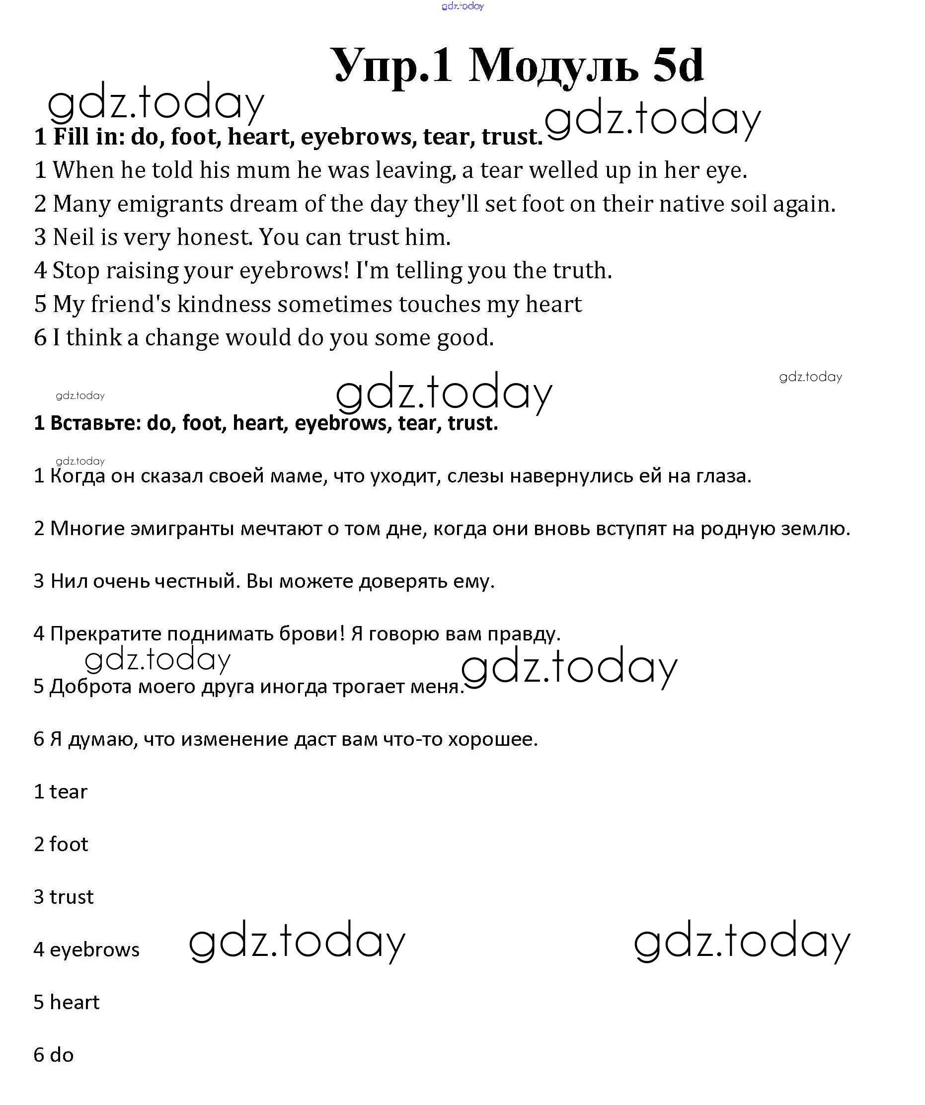 На страницах сайта gdz.today вы найдете учебный и вспомогательный материал, направленный на улучшения знаний школьной программы. ГДЗ - онлайн мир знаний Часть 5d Решение к Module 5 1 Рабочей тетради по Английскому языку для 10 класса Афанасьева, Дули Базовый уровень Просвещение Spotlight 2015