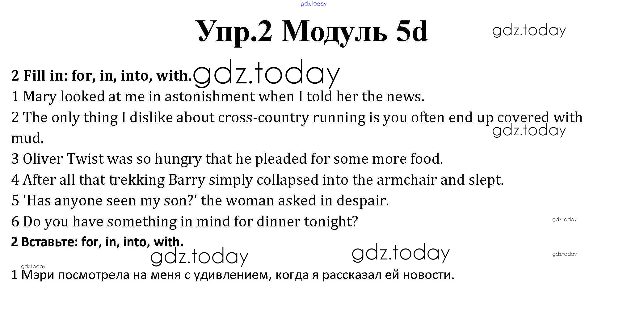 На страницах сайта gdz.today вы найдете учебный и вспомогательный материал, направленный на улучшения знаний школьной программы. ГДЗ - онлайн мир знаний Часть 5d Решение к Module 5 2 Рабочей тетради по Английскому языку для 10 класса Афанасьева, Дули Базовый уровень Просвещение Spotlight 2015