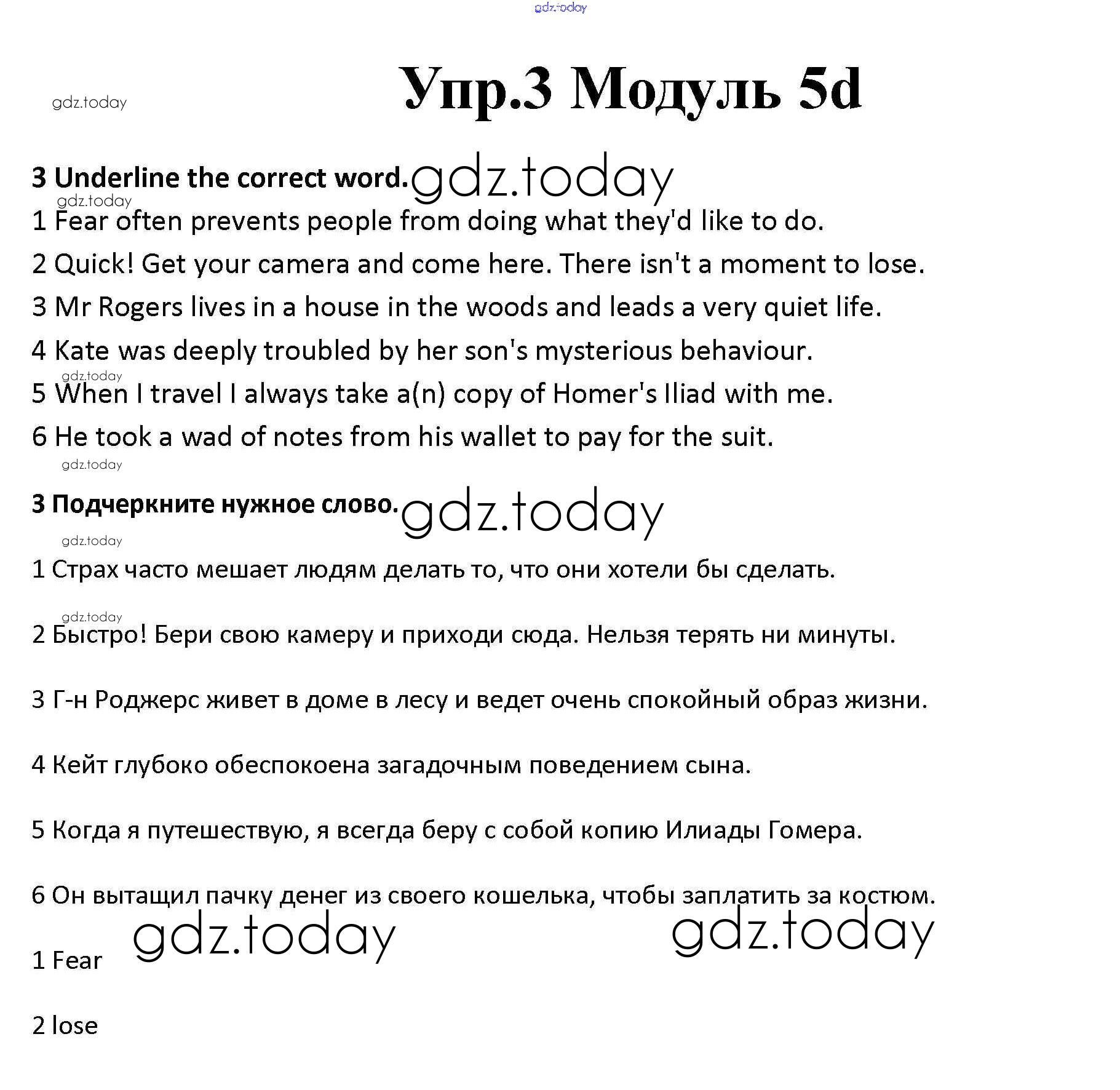 На страницах сайта gdz.today вы найдете учебный и вспомогательный материал, направленный на улучшения знаний школьной программы. ГДЗ - онлайн мир знаний Часть 5d Решение к Module 5 3 Рабочей тетради по Английскому языку для 10 класса Афанасьева, Дули Базовый уровень Просвещение Spotlight 2015