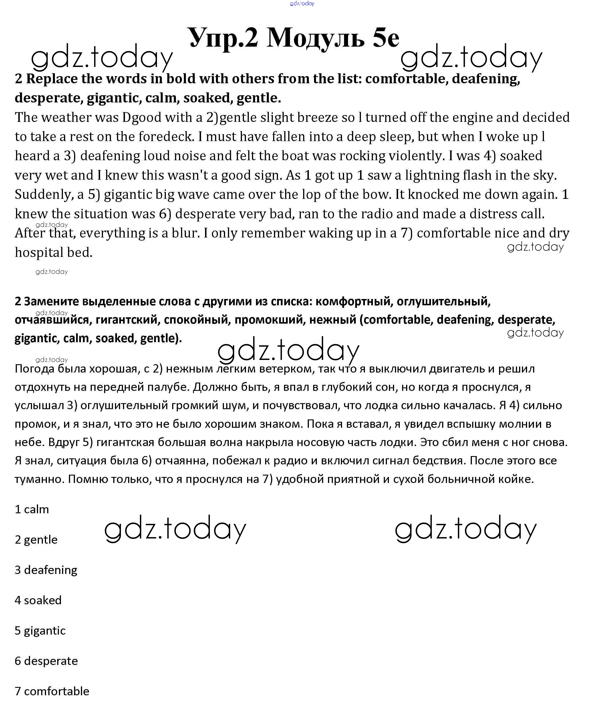 На страницах сайта gdz.today вы найдете учебный и вспомогательный материал, направленный на улучшения знаний школьной программы. ГДЗ - онлайн мир знаний Часть 5e Решение к Module 5 2 Рабочей тетради по Английскому языку для 10 класса Афанасьева, Дули Базовый уровень Просвещение Spotlight 2015