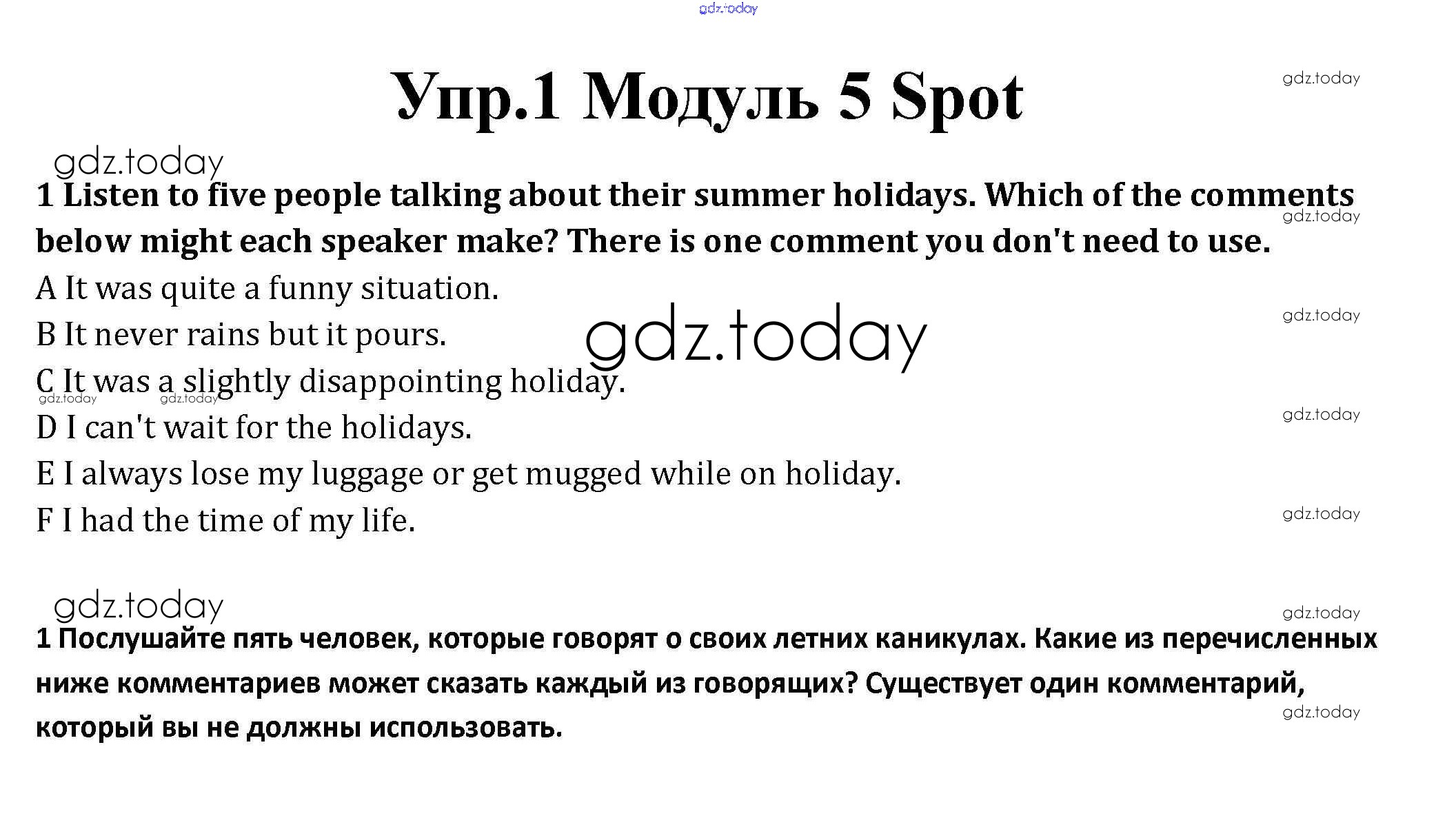 На страницах сайта gdz.today вы найдете учебный и вспомогательный материал, направленный на улучшения знаний школьной программы. ГДЗ - онлайн мир знаний Spotlight on Exams Решение к Module 5 1 Рабочей тетради по Английскому языку для 10 класса Афанасьева, Дули Базовый уровень Просвещение Spotlight 2015