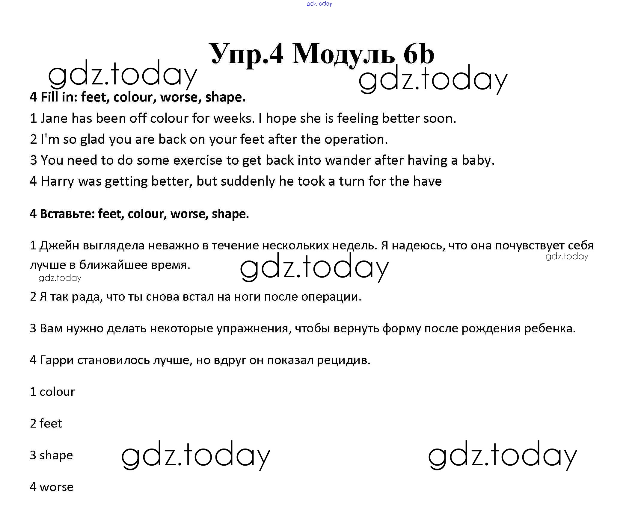 На страницах сайта gdz.today вы найдете учебный и вспомогательный материал, направленный на улучшения знаний школьной программы. ГДЗ - онлайн мир знаний Часть 6b Решение к Module 6 4 Рабочей тетради по Английскому языку для 10 класса Афанасьева, Дули Базовый уровень Просвещение Spotlight 2015
