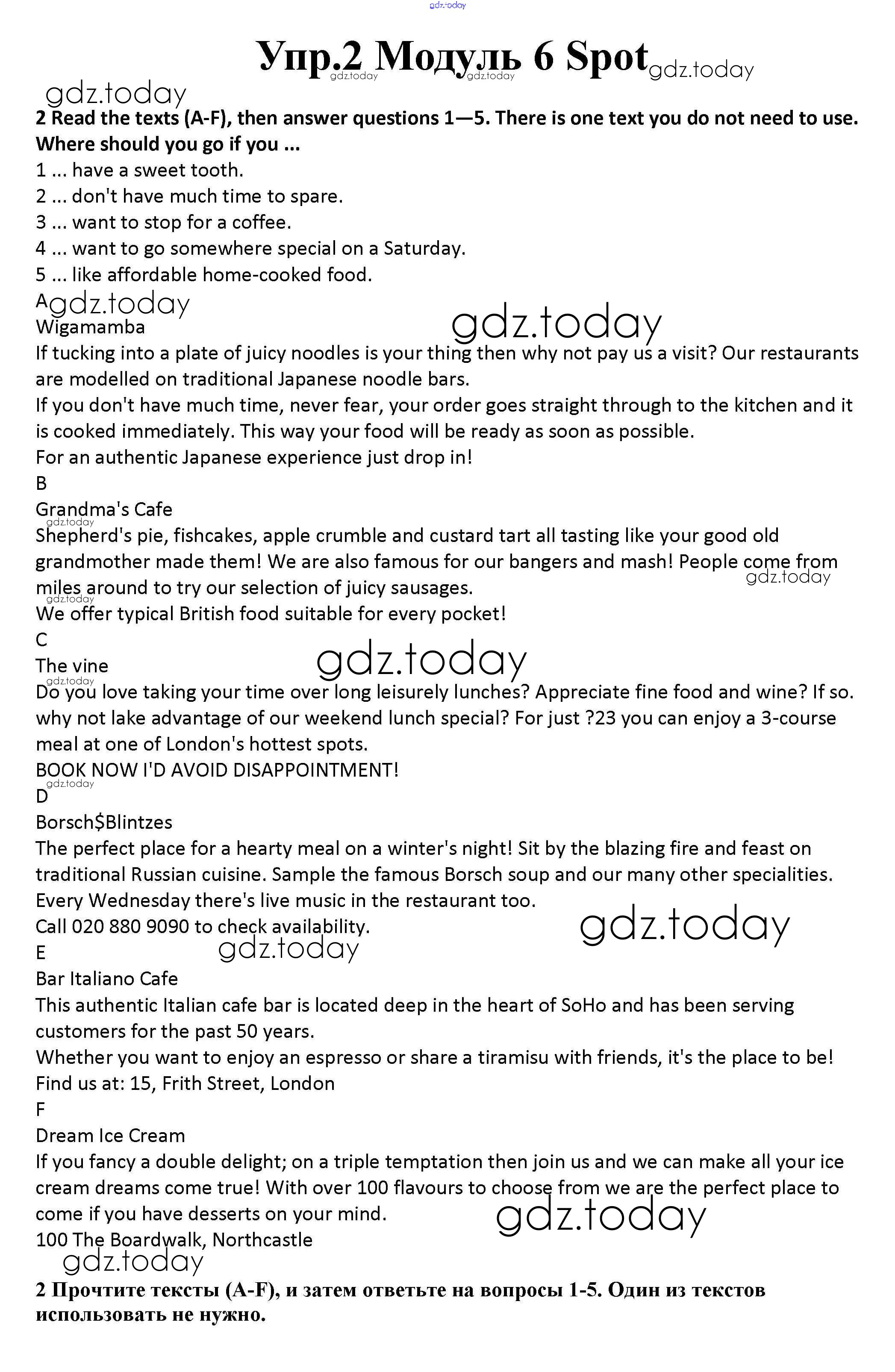 На страницах сайта gdz.today вы найдете учебный и вспомогательный материал, направленный на улучшения знаний школьной программы. ГДЗ - онлайн мир знаний Spotlight on Exams Решение к Module 6 2 Рабочей тетради по Английскому языку для 10 класса Афанасьева, Дули Базовый уровень Просвещение Spotlight 2015