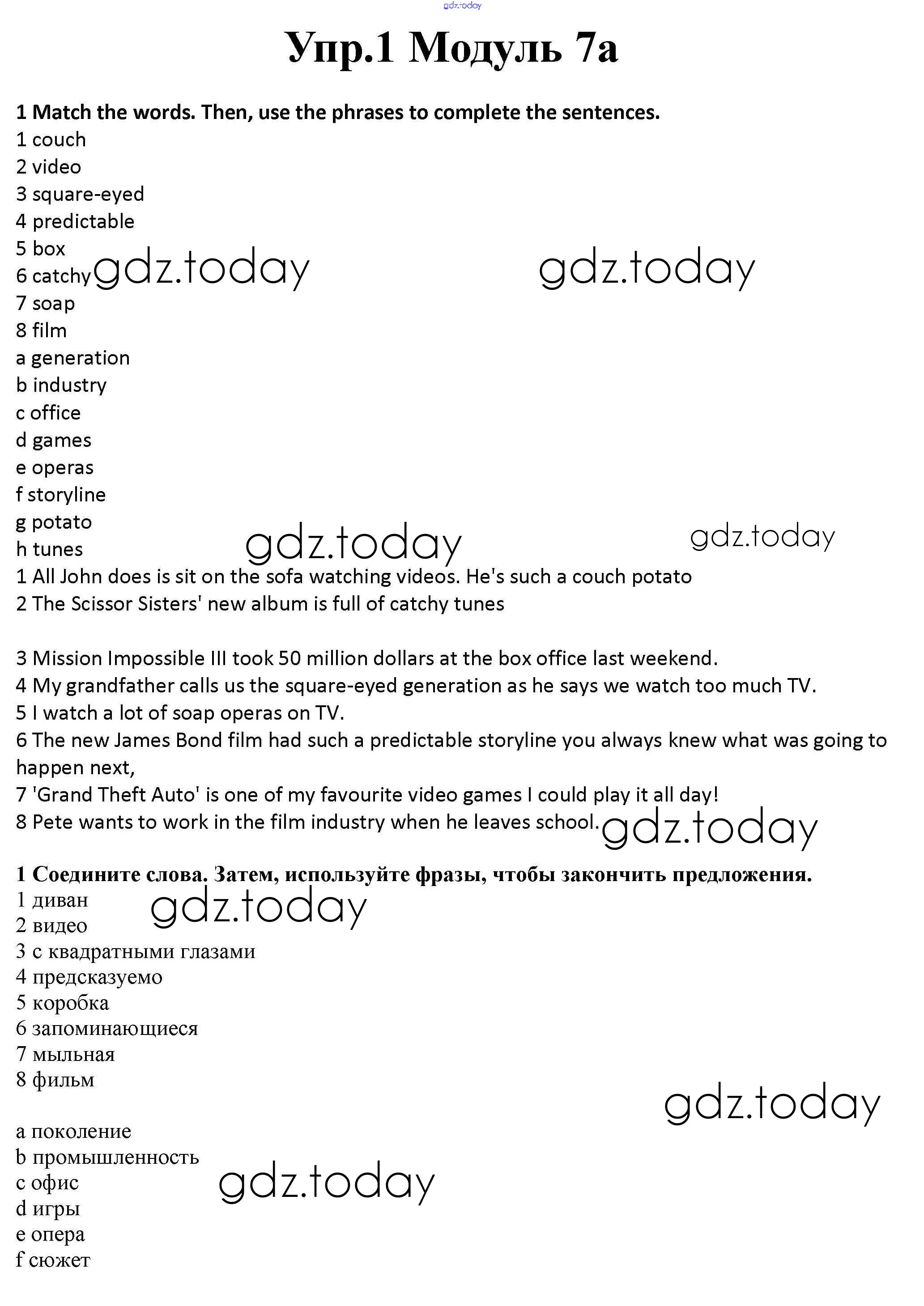 На страницах сайта gdz.today вы найдете учебный и вспомогательный материал, направленный на улучшения знаний школьной программы. ГДЗ - онлайн мир знаний Часть 7a Решение к Module 7 1 Рабочей тетради по Английскому языку для 10 класса Афанасьева, Дули Базовый уровень Просвещение Spotlight 2015