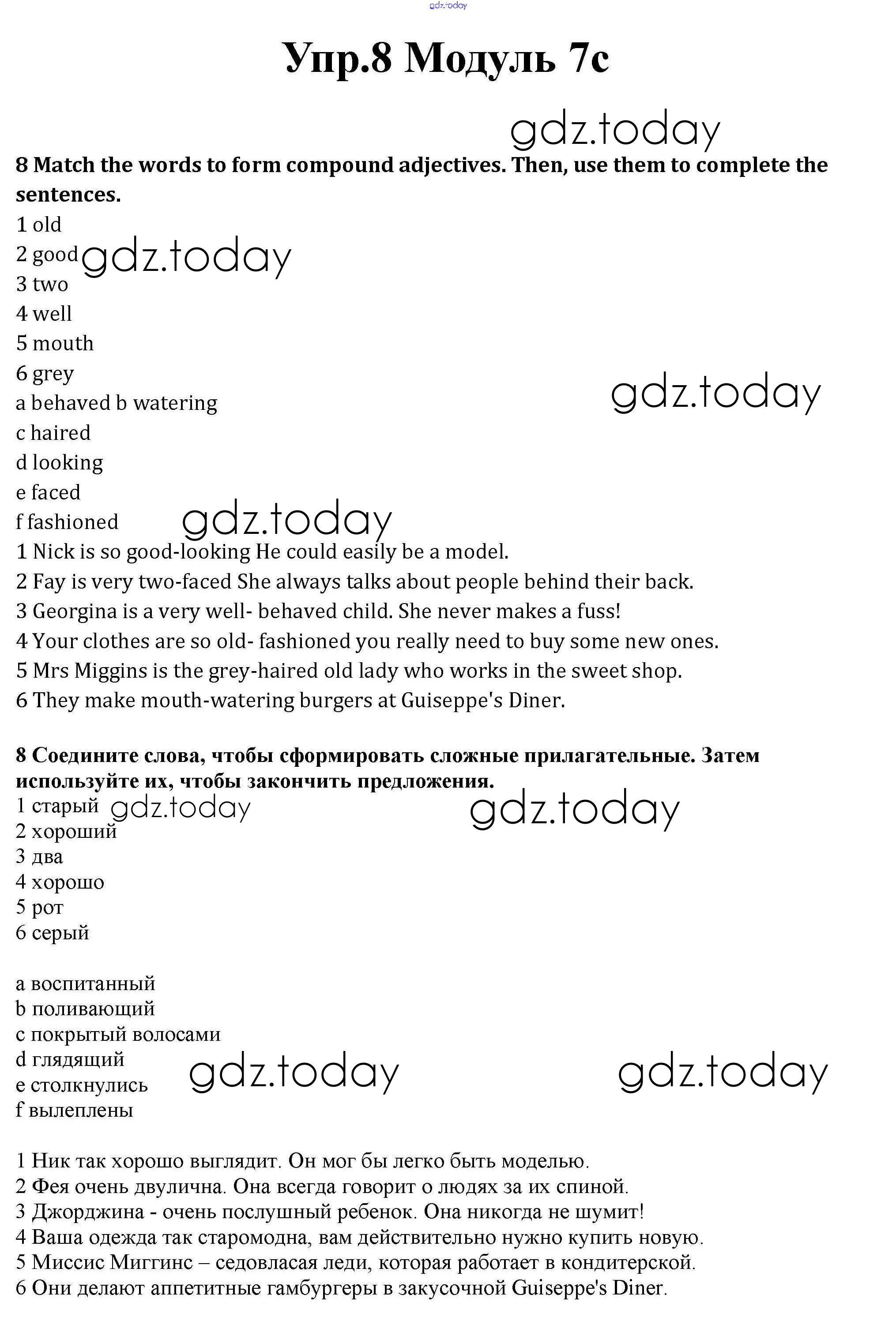 На страницах сайта gdz.today вы найдете учебный и вспомогательный материал, направленный на улучшения знаний школьной программы. ГДЗ - онлайн мир знаний Часть 7c Решение к Module 7 8 Рабочей тетради по Английскому языку для 10 класса Афанасьева, Дули Базовый уровень Просвещение Spotlight 2015