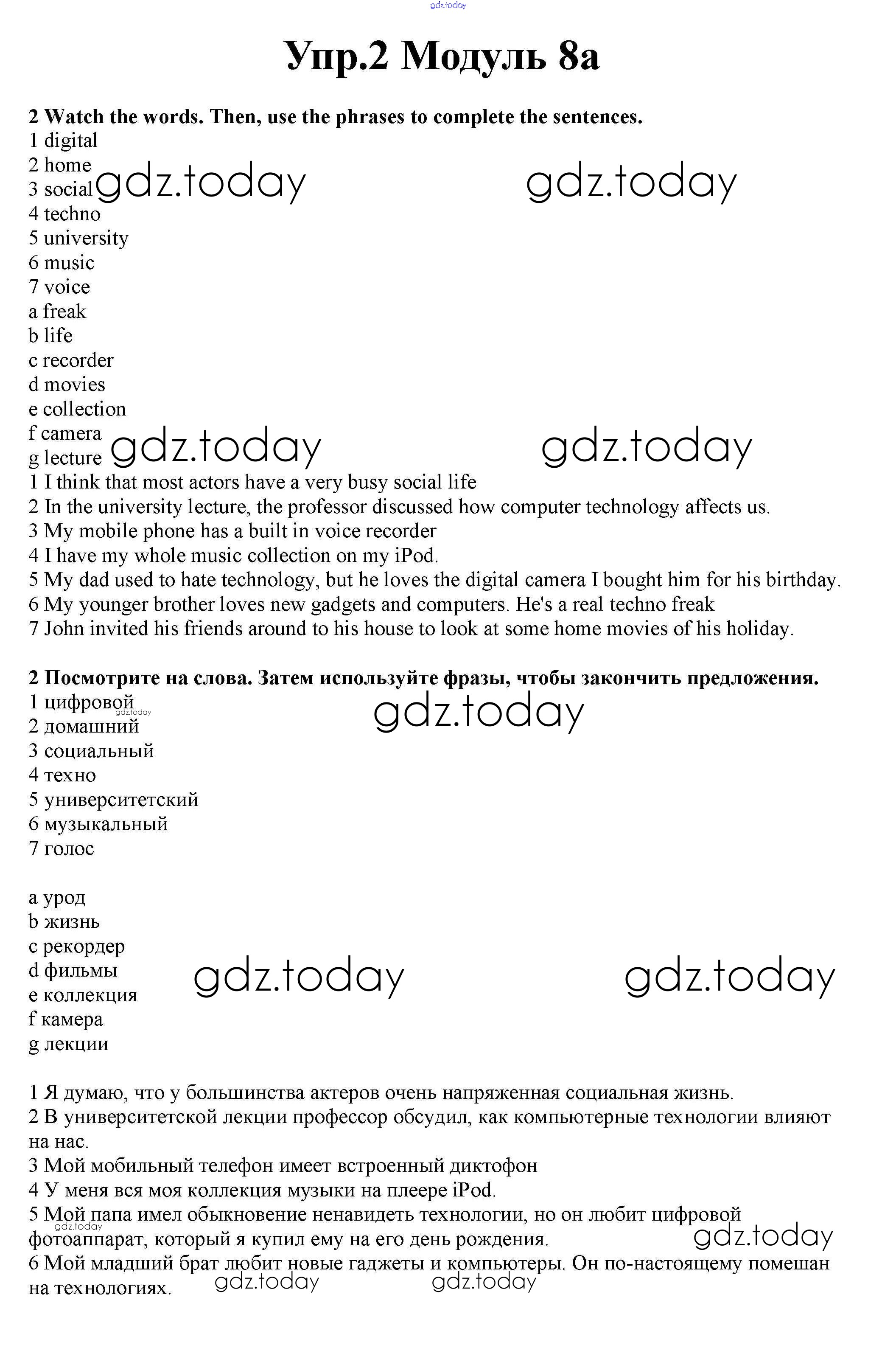 На страницах сайта gdz.today вы найдете учебный и вспомогательный материал, направленный на улучшения знаний школьной программы. ГДЗ - онлайн мир знаний Часть 8a Решение к Module 8 2 Рабочей тетради по Английскому языку для 10 класса Афанасьева, Дули Базовый уровень Просвещение Spotlight 2015