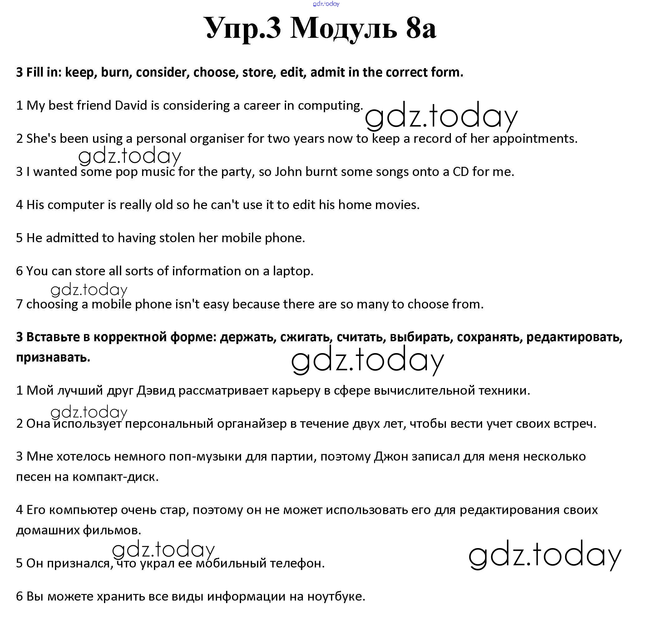 На страницах сайта gdz.today вы найдете учебный и вспомогательный материал, направленный на улучшения знаний школьной программы. ГДЗ - онлайн мир знаний Часть 8a Решение к Module 8 3 Рабочей тетради по Английскому языку для 10 класса Афанасьева, Дули Базовый уровень Просвещение Spotlight 2015