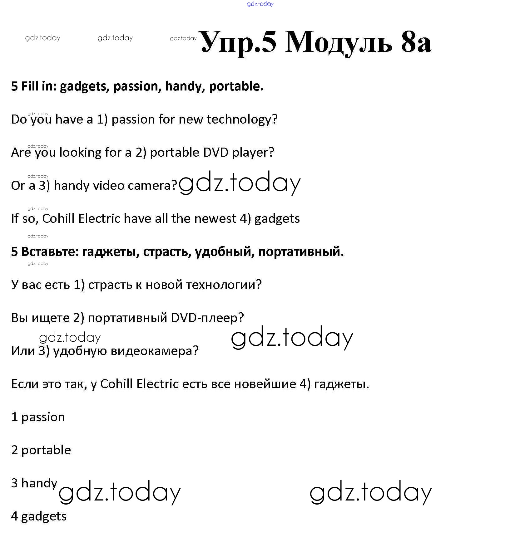 На страницах сайта gdz.today вы найдете учебный и вспомогательный материал, направленный на улучшения знаний школьной программы. ГДЗ - онлайн мир знаний Часть 8a Решение к Module 8 5 Рабочей тетради по Английскому языку для 10 класса Афанасьева, Дули Базовый уровень Просвещение Spotlight 2015