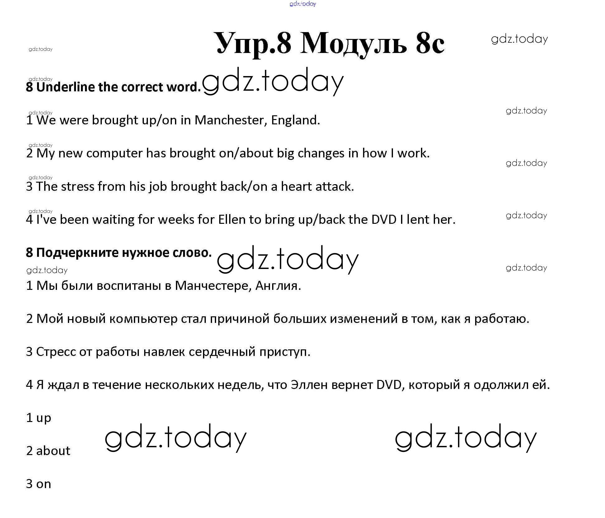 На страницах сайта gdz.today вы найдете учебный и вспомогательный материал, направленный на улучшения знаний школьной программы. ГДЗ - онлайн мир знаний Часть 8c Решение к Module 8 8 Рабочей тетради по Английскому языку для 10 класса Афанасьева, Дули Базовый уровень Просвещение Spotlight 2015