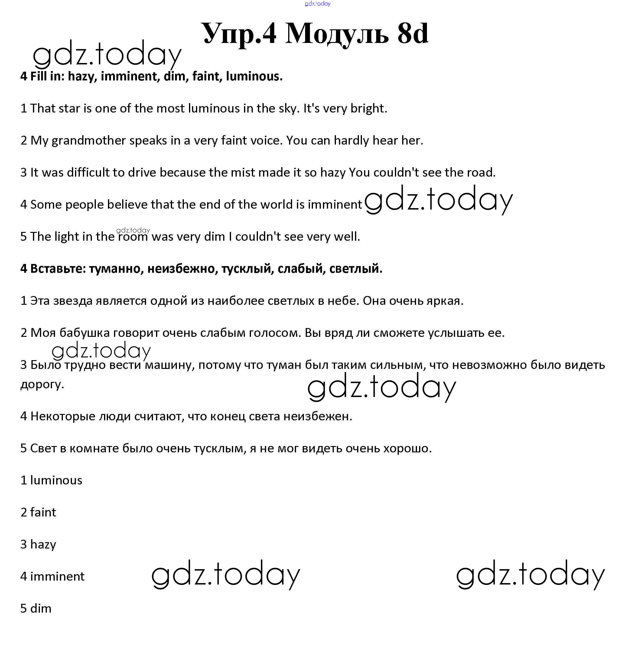 На страницах сайта gdz.today вы найдете учебный и вспомогательный материал, направленный на улучшения знаний школьной программы. ГДЗ - онлайн мир знаний Часть 8d Решение к Module 8 4 Рабочей тетради по Английскому языку для 10 класса Афанасьева, Дули Базовый уровень Просвещение Spotlight 2015