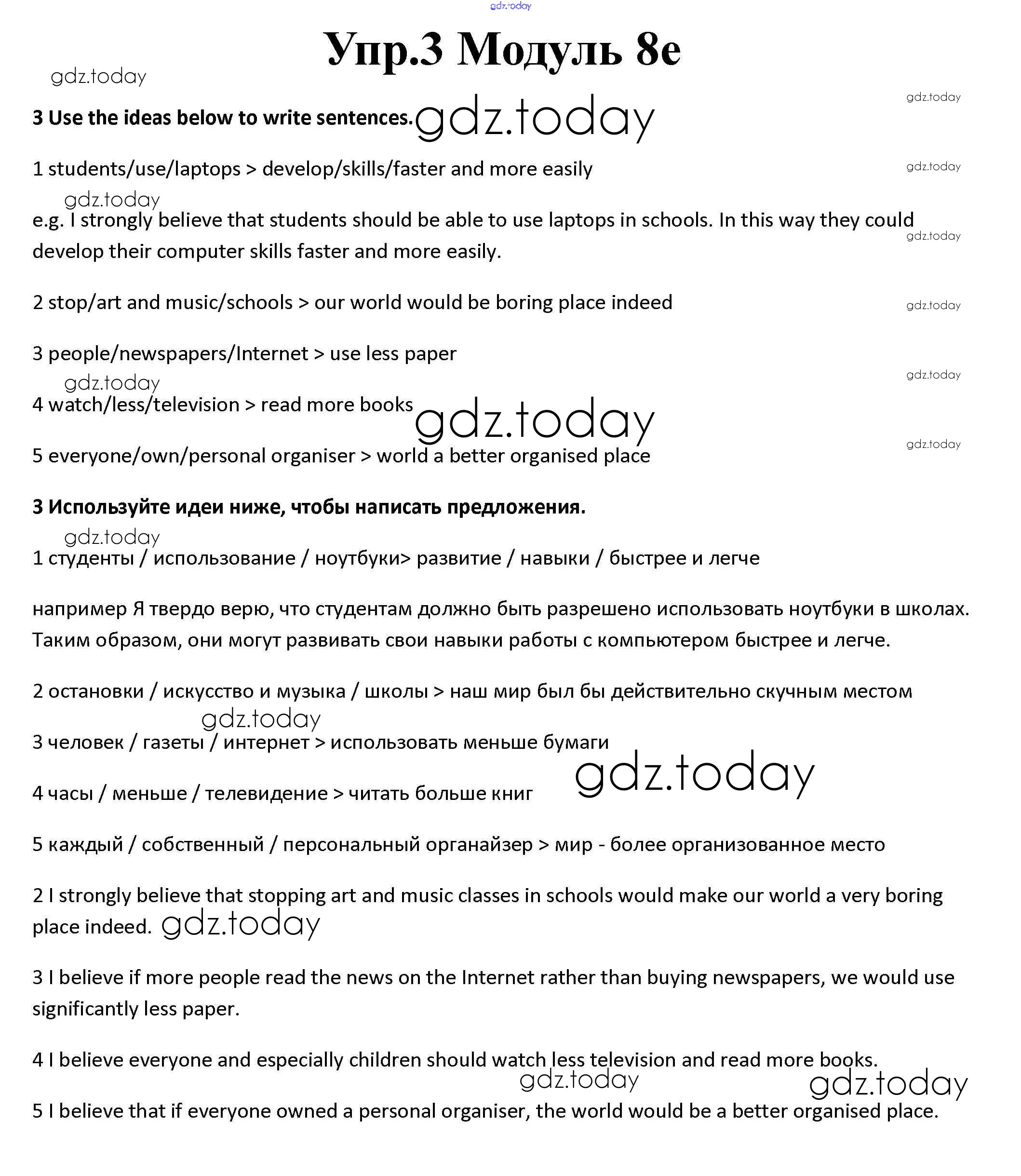На страницах сайта gdz.today вы найдете учебный и вспомогательный материал, направленный на улучшения знаний школьной программы. ГДЗ - онлайн мир знаний Часть 8e Решение к Module 8 3 Рабочей тетради по Английскому языку для 10 класса Афанасьева, Дули Базовый уровень Просвещение Spotlight 2015