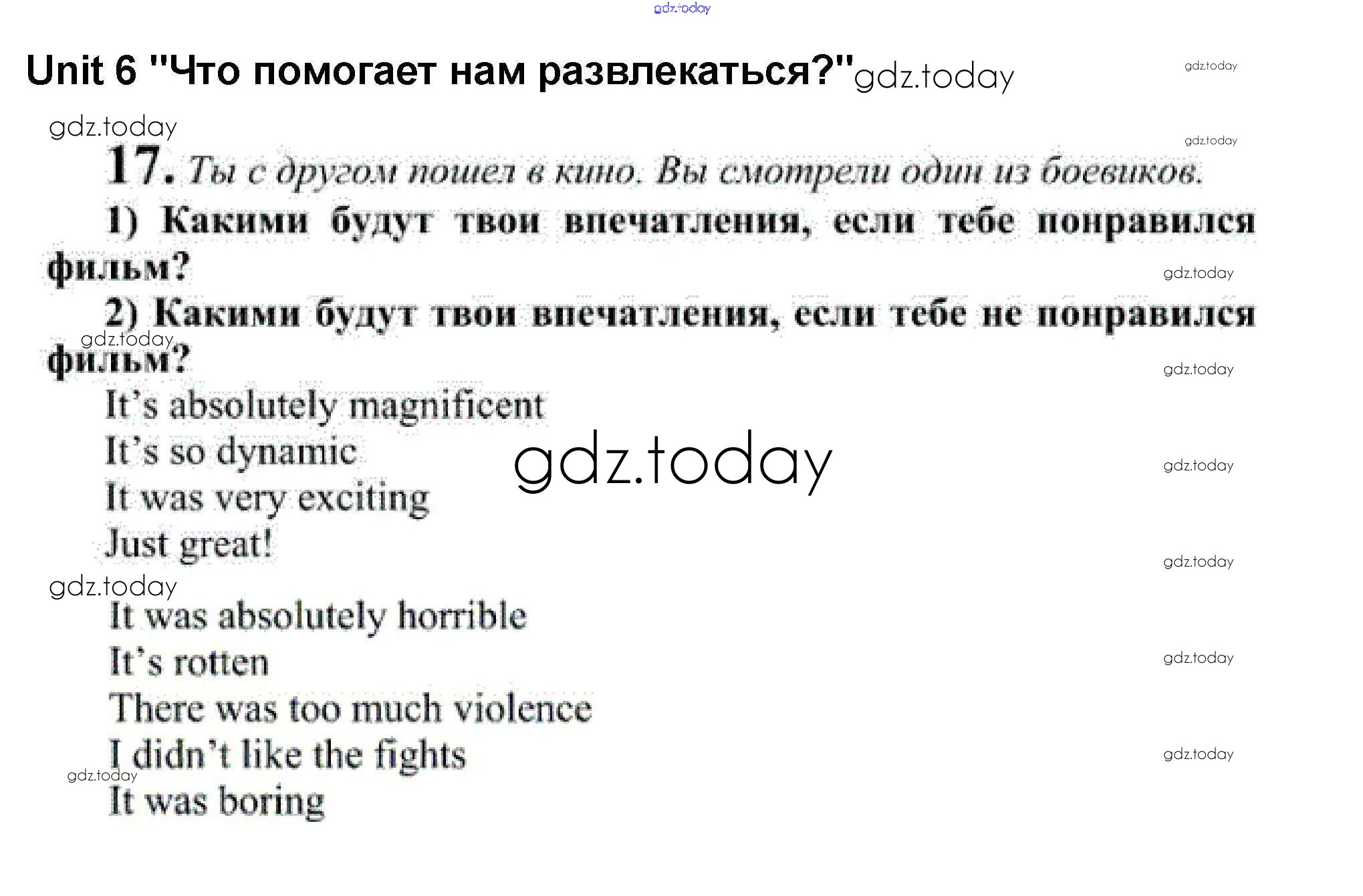 На страницах сайта gdz.today вы найдете учебный и вспомогательный материал, направленный на улучшения знаний школьной программы. ГДЗ - онлайн мир знаний Решение к Unit 6. What Helps You to Enjoy Yourselves? 17 Рабочей тетради по Английскому языку для 10-11 класса Кузовлев, Лапа Просвещение УМК 2012
