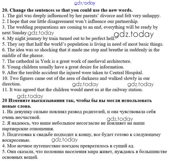 На страницах сайта gdz.today вы найдете учебный и вспомогательный материал, направленный на улучшения знаний школьной программы. ГДЗ - онлайн мир знаний Решение к Unit 1. Man the Creator 20 Учебнику по Английскому языку для 10 класса Афанасьева, Михеева Углубленный уровень Просвещение 2014