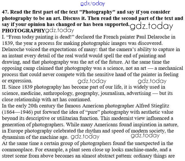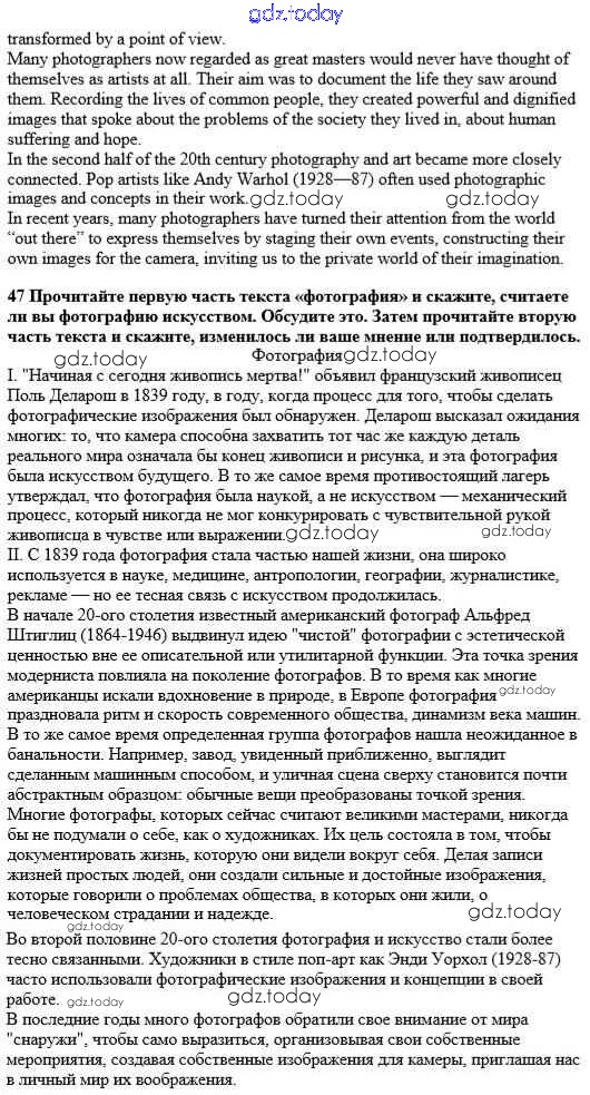 На страницах сайта gdz.today вы найдете учебный и вспомогательный материал, направленный на улучшения знаний школьной программы. ГДЗ - онлайн мир знаний Решение к Unit 1. Man the Creator 47 Учебнику по Английскому языку для 10 класса Афанасьева, Михеева Углубленный уровень Просвещение 2014