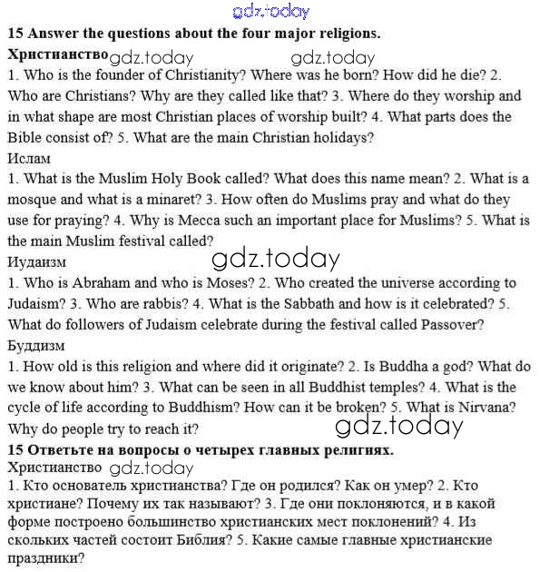 На страницах сайта gdz.today вы найдете учебный и вспомогательный материал, направленный на улучшения знаний школьной программы. ГДЗ - онлайн мир знаний Решение к Unit 2. Man the Beliver 15 Учебнику по Английскому языку для 10 класса Афанасьева, Михеева Углубленный уровень Просвещение 2014