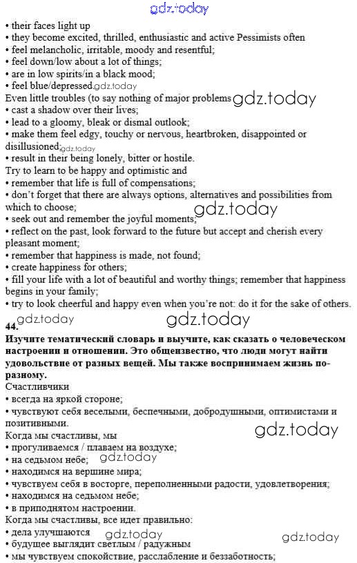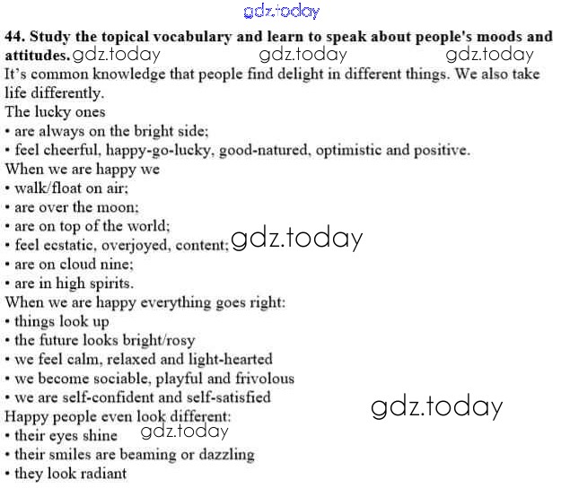 На страницах сайта gdz.today вы найдете учебный и вспомогательный материал, направленный на улучшения знаний школьной программы. ГДЗ - онлайн мир знаний Решение к Unit 4. Man - the Speeker of Happiness 44 Учебнику по Английскому языку для 10 класса Афанасьева, Михеева Углубленный уровень Просвещение 2014