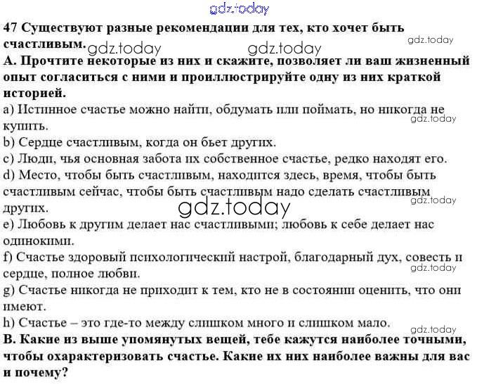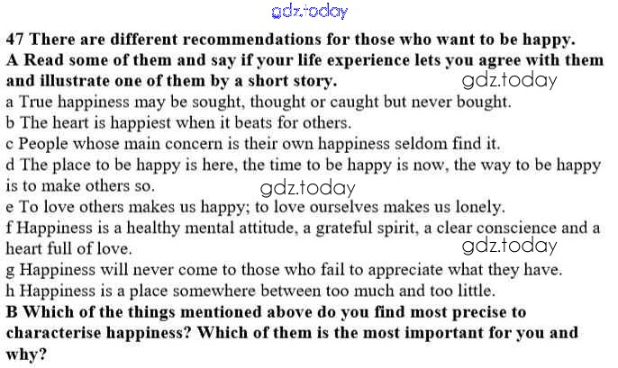 На страницах сайта gdz.today вы найдете учебный и вспомогательный материал, направленный на улучшения знаний школьной программы. ГДЗ - онлайн мир знаний Решение к Unit 4. Man - the Speeker of Happiness 47 Учебнику по Английскому языку для 10 класса Афанасьева, Михеева Углубленный уровень Просвещение 2014