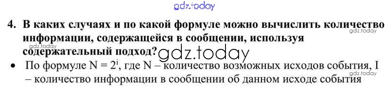 На страницах сайта gdz.today вы найдете учебный и вспомогательный материал, направленный на улучшения знаний школьной программы. ГДЗ - онлайн мир знаний Решение к §4. Измерение информации. Содержательный подход 4 Учебнику по Информатике для 10 класса Семакин, Хеннер Базовый уровень Бином 2017