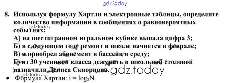 На страницах сайта gdz.today вы найдете учебный и вспомогательный материал, направленный на улучшения знаний школьной программы. ГДЗ - онлайн мир знаний Решение к §4. Измерение информации. Содержательный подход 8 Учебнику по Информатике для 10 класса Семакин, Хеннер Базовый уровень Бином 2017